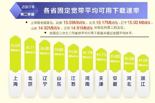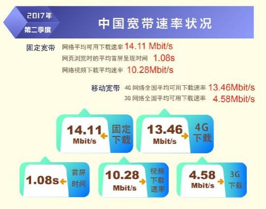 日前,寬帶發(fā)展聯(lián)盟發(fā)布了第 16 期《中國(guó)寬帶速率狀況報(bào)告》(2017 年第二季度)。報(bào)告顯示 2017 年第二季度我國(guó)固定寬帶網(wǎng)絡(luò)平均下載速率達(dá)到 14.11Mbit/s,比 2017 年第一季度提高了1.1Mbit/s,同比去年第一季度提升了 34.8%。自 2015 網(wǎng)絡(luò)“提速降費(fèi)”工作開(kāi)展以來(lái),我國(guó)固定寬帶可用下載速率連續(xù) 10 個(gè)季度持續(xù)提升,總提升幅度達(dá)到 3.3 倍。同時(shí),我國(guó)移動(dòng)寬帶用戶使用 4G 網(wǎng)絡(luò)訪問(wèn)互聯(lián)網(wǎng)時(shí)的平均下載速率達(dá)到 13.46Mbit/s,環(huán)比 2017 年第一季度也有 14.2%的提升。